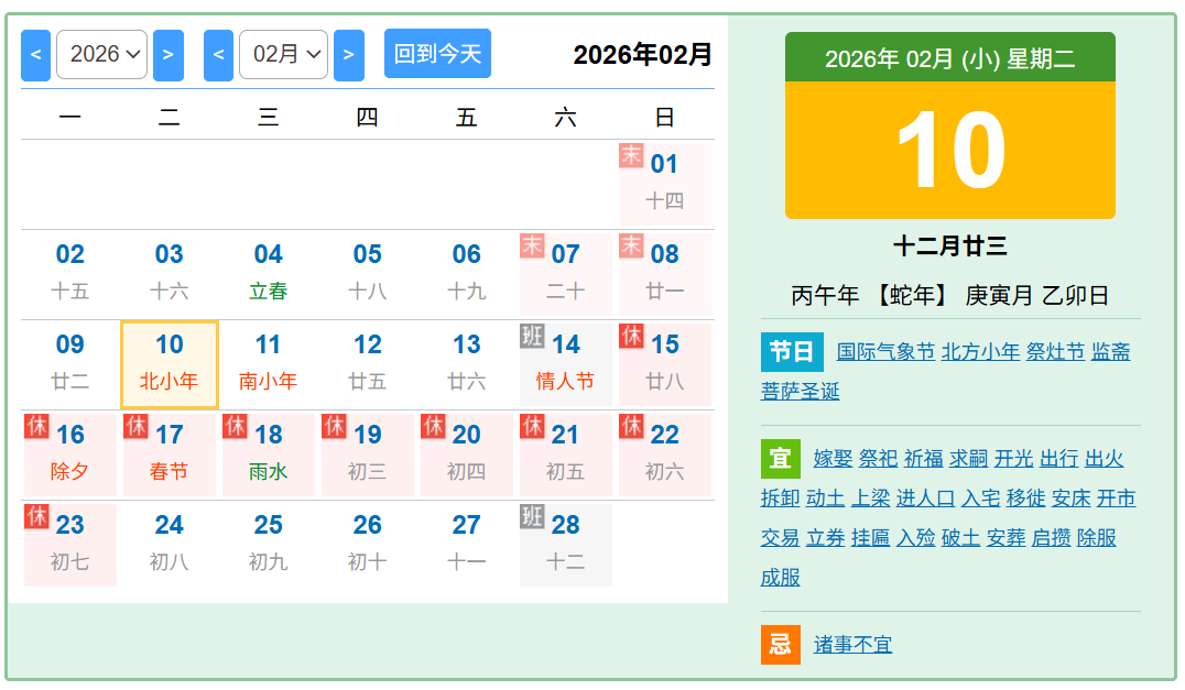放假时间: 2026 年 2 月 14 日(周六)至 2 月23 日(周一),共计 10 天。